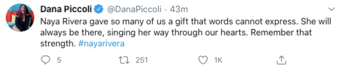 "Naya Rivera nos deu um presente que palavras não podem expressar. Ela sempre estará lá, cantando diretamente para nossos corações. Lembraremos dessa força", declarou Piccoli.
