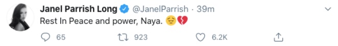 "Descanse em paz e força, Naya", tweetou Parrish seguida de carinha triste e coração partido.