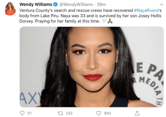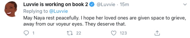 "Que Naya possa descansar em paz e espero que a família tenha espaço para viver o luto longe de nossos olhos 'voyeur'. Eles merecem isso", tweetou Luvvie.