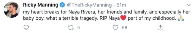 "Meu coração está partido por Naya Rivera, seus amigos, família e especialmente seu filho pequeno. Que tragédia horrível! RIP Naya, parte da minha infância", escreveu Manning.