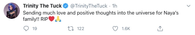 "Enviando muito amor e pensamentos positivos pelo universo para a família de Naya. RIP", escreveu a drag queen Trinity.