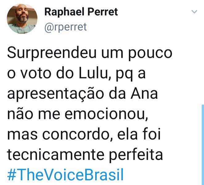 “O seu cantar, o jeito como você se entrega, seu pseudo nervosismo faz parte. Isso aqui é uma passagem, você é uma semifinalista e isso é muito forte. Seu talento te trouxe aqui”, avaliou o técnico.