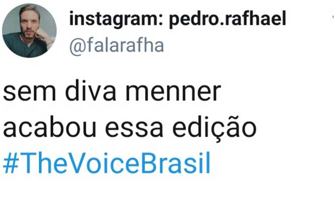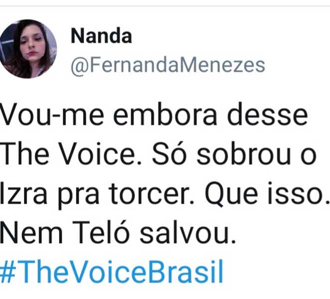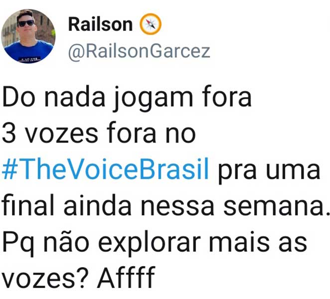 “Uma palavra para o seu voto hoje, no The Voice: aff”, escreveu um internauta.