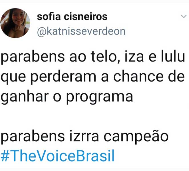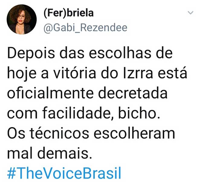 “Que isso, Iza? Eu te adoro, mas sua escolha foi péssima e você perdeu a oportunidade de quebrar a vitória do Teló”, afirmou uma seguidora.