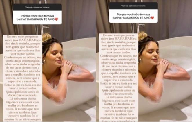 “Eu amo essas perguntas sobre isso, eu fico rindo sozinha, porque tem gente que realmente acredita que eu ficava dias sem tomar banho. Confesso que eu odiava, me sentia mega constrangida, observada, tinha vergonha de me lavar direito com a câmera virando e sabendo que o espelho também era câmera, sem contar que é super frio na casa toda”., começou explicando ela.
