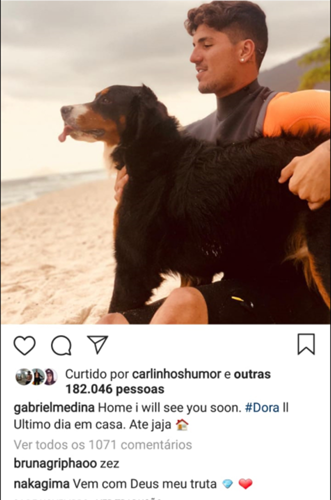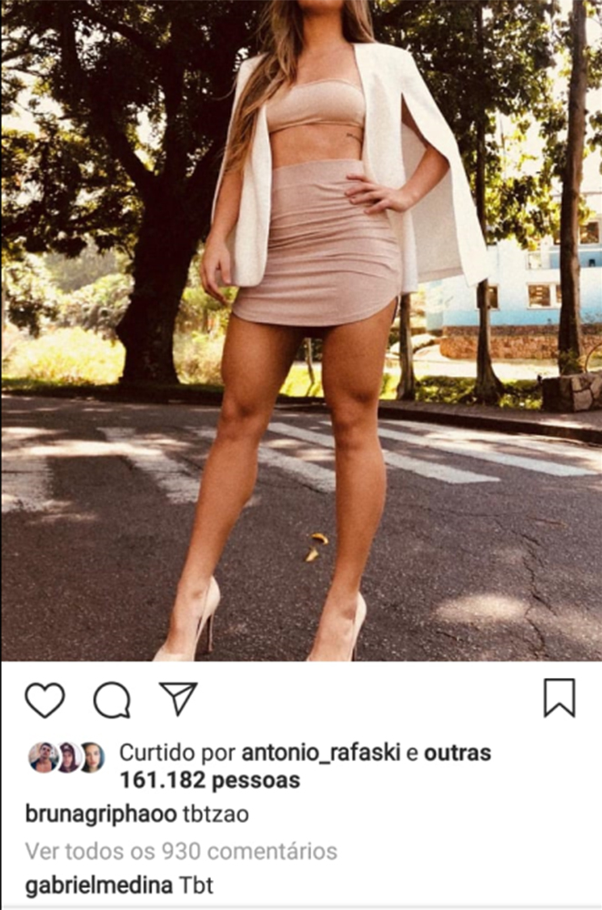 De acordo com a publicação, Gabriel Medina e a atriz Bruna Griphao estariam vivendo um romance desde o final do mês de novembro, quando eles se encontraram em Maresias, onde Medina vive, antes dele embarcar para o exterior.