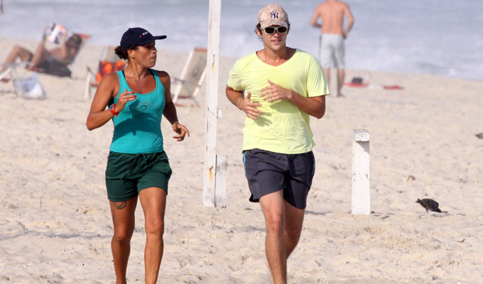 Acompanhado da personal trainer, Gil correu debaixo do forte sol usando um boné, camisa e bermuda.