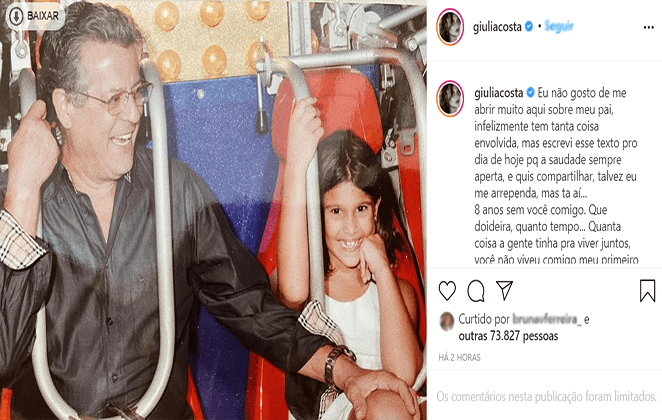 Nesta quarta-feira (11), Giulia Costa utilizou as redes sociais para prestar uma homenagem ao pai, Marcos Paulo, que faleceu há oito anos devido a uma embolia pulmonar em 2012.