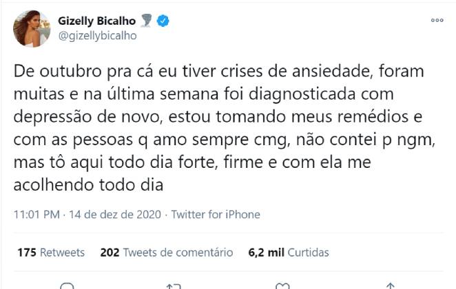 "De outubro pra cá eu tive crises de ansiedade. Foram muitas e na última semana eu fui diagnosticada com depressão de novo. Estou tomando meus remédios e com as pessoas que amo sempre comigo. Não contei pra ninguém, mas tô aqui todo dia forte, firme e com ela me acolhendo todo dia”, escreveu Gizelly, citando o apoio de Marcela McGowan, também ex-sister do BBB20, com quem construiu uma amizade dentro e fora do reality.