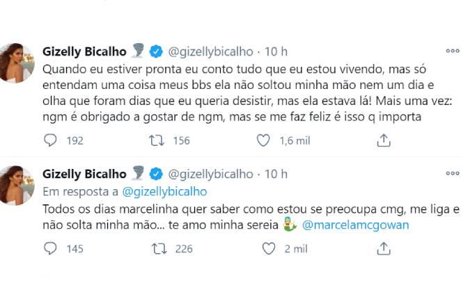 "A nossa amizade pode não agradar a toda população, mas eu queria tanto a compreensão de toda população. Eu e Ma vamos estar pra sempre. Ouvir dela que eu ensinei pra ela o que era amizade e o seu significado é tão gratificante. Por fim, eu quero pedir respeito à nossa amizade. Eu sou amiga da Marcela e das outras meninas também e tá tudo bem!!! Nos últimos dias eu vivi momentos de trevas, só eu sei o que sofri e ela estava lá segurando minha mão… Não conto tudo o que tá rolando aqui", ainda explicou Gizelly, que exaltou a amiga.