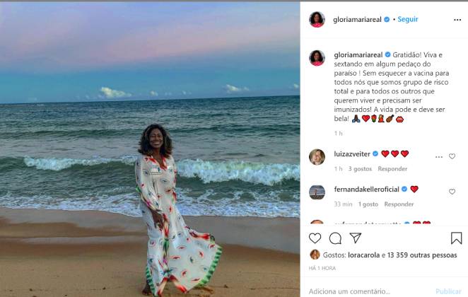 "Gratidão! Viva e sextando em algum pedaço do paraíso! Sem esquecer a vacina para todos nós que somos grupo de risco total e para todos os outros que querem viver e precisam ser imunizados!", começou ela, que em seguida finalizou: "A vida pode e deve ser bela!"