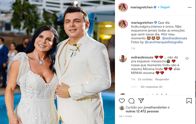 O amor está no ar! Na quinta-feira (10), Gretchen mais uma vez declarou todo seu amor ao marido Esdras. Em seu Instagram, a cantora aproveitou o dia de TBT e publicou uma foto do casamento com o músico.