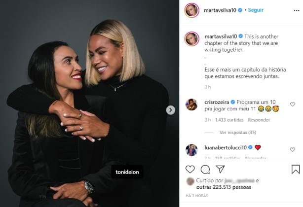 "Esse é mais um capítulo da história que estamos escrevendo juntas", escreveu Marta na legenda da publicação com as várias fotos em que aparece ao lado de Toni em um ensaio, ambas de aliança e anel de noivado.
