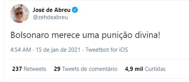 Em outro post, ele acrescentou: “Bolsonaro quebrou o dito popular “DEUS É BRASILEIROl. Alguém ainda acredita nisso?”.