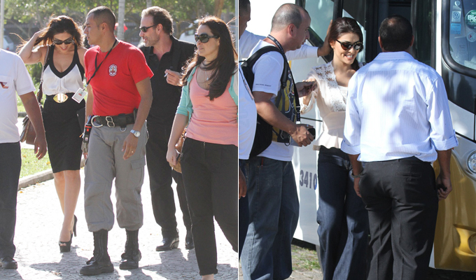 A atriz circulou pelo set de gravação com um belo decote e uma saia longa justíssima, que evidenciava a boa forma de Juliana. Após o trabalho, ela trocou de roupa em um ônibus e foi embora.
