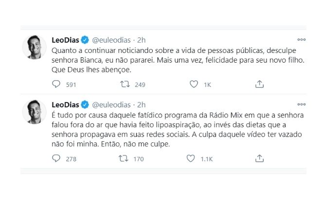 Em resposta, nesta quinta-feira (21), Léo Dias fez dois tweets e se defendeu das acusações: