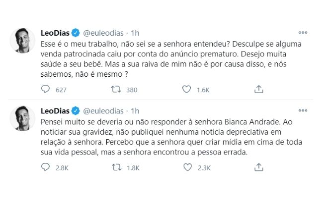"Pensei muito se deveria ou não responder à senhora Bianca Andrade. Ao noticiar sua gravidez, não publiquei nenhuma noticia depreciativa em relação à senhora. Percebo que a senhora quer criar mídia em cima de toda sua vida pessoal, mas a senhora encontrou a pessoa errada. Esse é o meu trabalho, não sei se a senhora entendeu? Desculpe se alguma venda patrocinada caiu por conta do anúncio prematuro. Desejo muita saúde a seu bebê. Mas a sua raiva de mim não é por causa disso, e nós sabemos, não é mesmo? É tudo por causa daquele fatídico programa da Rádio Mix em que a senhora falou fora do ar que havia feito lipoaspiração, ao invés das dietas que a senhora propagava em suas redes sociais. A culpa daquele vídeo ter vazado não foi minha. Então, não me culpe. Quanto a continuar noticiando sobre a vida de pessoas públicas, desculpe senhora Bianca, eu não pararei. Mais uma vez, felicidade para seu novo filho. Que Deus lhes abençoe.", declarou ele em sua conta oficial do Twitter.