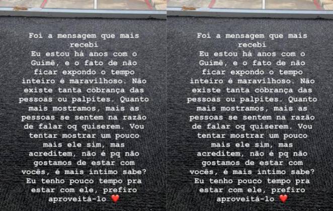 "Estou há anos com o Guimê, e o fato de não ficar expondo o tempo inteiro é maravilhoso. Não existe tanta cobrança das pessoas ou palpites. Quanto mais mostramos, mais as pessoas se sentem na razão de falar o que quiserem", contou a artista.
