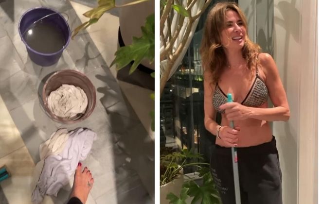 "Rindo de nervoso", começou Gimenez em seus stories no Instagram, filmando os baldes cheios de água e os panos encharcados enquanto gargalhava com a situação caótica.