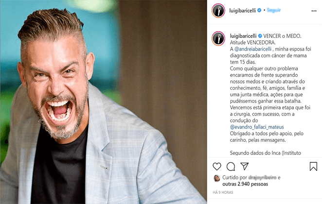 “VENCER o MEDO. Atitude VENCEDORA. A @andreiabaricelli , minha esposa, foi diagnosticada com câncer de mama tem 15 dias. Como qualquer outro problema encaramos de frente superando nossos medos e criando através do conhecimento, fé, amigos, família e uma junta médica, ações para que pudéssemos ganhar essa batalha.Vencemos está primeira etapa que foi a cirurgia, com sucesso, com a condução do @evandro_fallaci_mateus. Obrigado a todos pelo apoio, pelo carinho, pelas mensagens.”