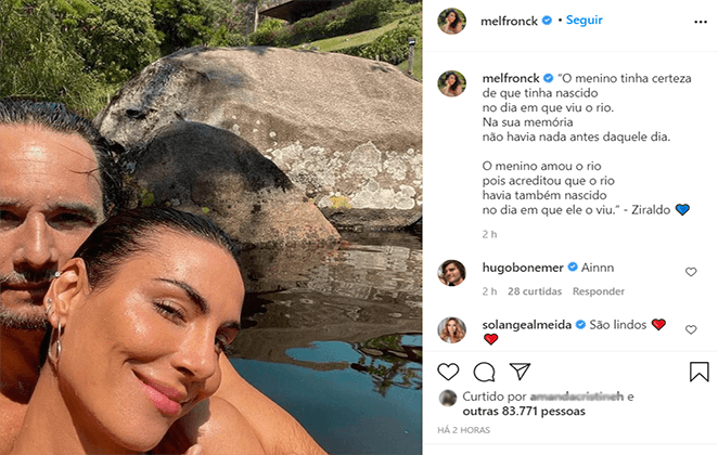 Desta vez também não foi diferente, quando nesta quarta-feira (25) a atriz Mel Fronckowiak postou em sua conta oficial do Instagram uma foto com o maridão, onde os dois aparecem juntinhos em um cenário de natureza.