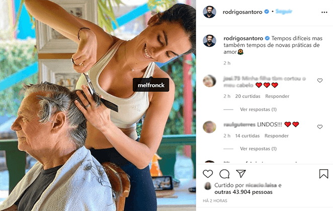 Na última quarta-feira (18), Rodrigo Santoro encantou fãs e seguidores ao compartilhar um momento afetuoso e especial em sua conta oficial do Instagram. O ator postou uma foto em que sua mulher, a atriz Mel Fronckowiak, aparece cortando o cabelo de seu pai, Francesco Santoro.