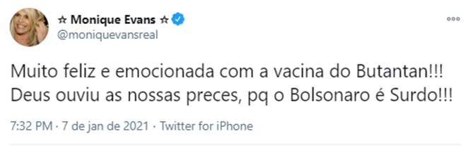 "Muito feliz e emocionada com a vacina do Butantan! Deus ouviu as nossas preces, porque o Bolsonaro é surdo", escreveu Monique.