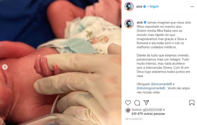 Alok também se pronunciou a respeito da novidade e não conteve a emoção. "Jamais imaginei que meus dois filhos nasceriam no mesmo ano. Ontem minha filha Raika veio ao mundo mais rápido do que imaginávamos, mas graças à Deus a Romana e ela estão bem e sob os melhores cuidados médicos. Diante de tudo que estamos vivendo, presenciamos mais um milagre. Tudo muito intenso, mas nada acontece sem a intervenção Divina. Com fé em Deus logo estaremos todos juntos em casa", completou o Dj, se referindo também à Ravi, de 10 meses.