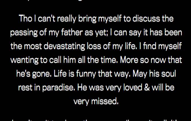 "Embora eu realmente não consiga falar sobre o falecimento do meu pai ainda, posso dizer que foi a perda mais devastadora da minha vida. Me vejo querendo ligar para ele o tempo todo. Ainda mais agora que ele se foi. A vida é engraçada assim. Que sua alma descanse no paraíso. Ele foi muito amado e fará muita falta", declarou a rapper em uma grande nota de seu portal, em que a artista também tratava de outros assuntos e novidades.