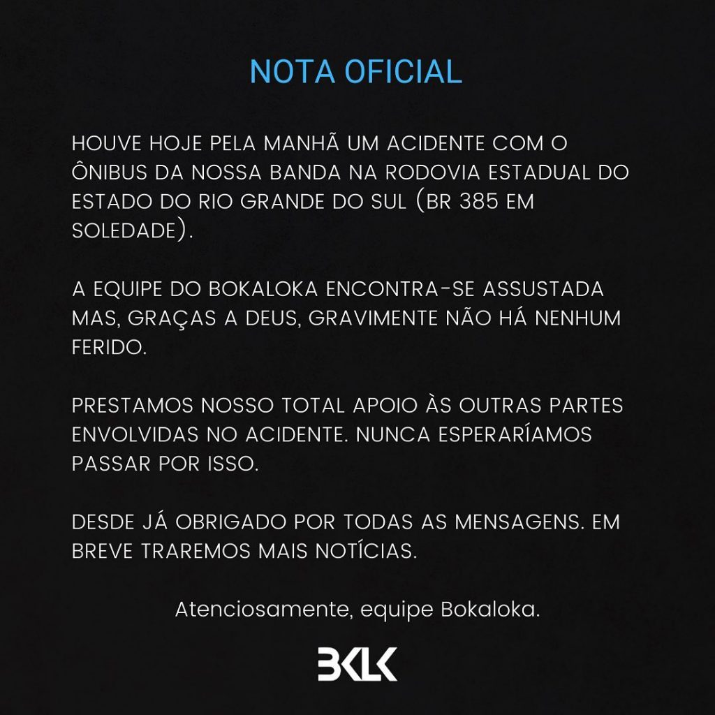“Houve hoje pela manhã um acidente com o ônibus da nossa banda na rodovia estadual do estado do rio grande do sul (BR 385 em Soledade). A equipe do Bokaloka encontra-se assustada, mas, graças a Deus, gravemente não há nenhum ferido. Prestamos nosso total apoio às outras partes envolvidas no acidente. Nunca esperaríamos passar por isso. Desde já obrigado por todas as mensagens”.