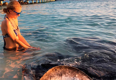 "Ele está chupando a minha perna. Isso me assustou. Me divertindo muito alimentando as arraias", escreveu ela.