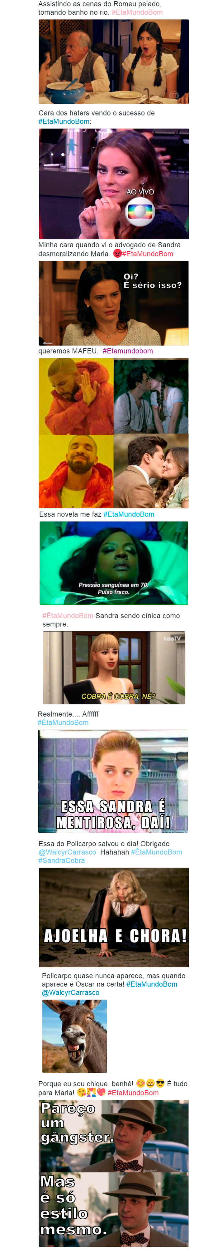 Aproveitando esta reta final de Êta Mundo Bom, a reportagem de OFuxico decidiu reunir dez dos melhores memes já feitos, da novela, que, inclusive, já está deixando saudade. Confira abaixo e divirta-se também!