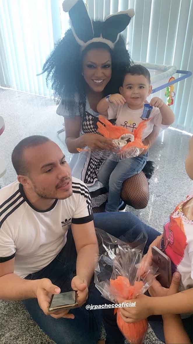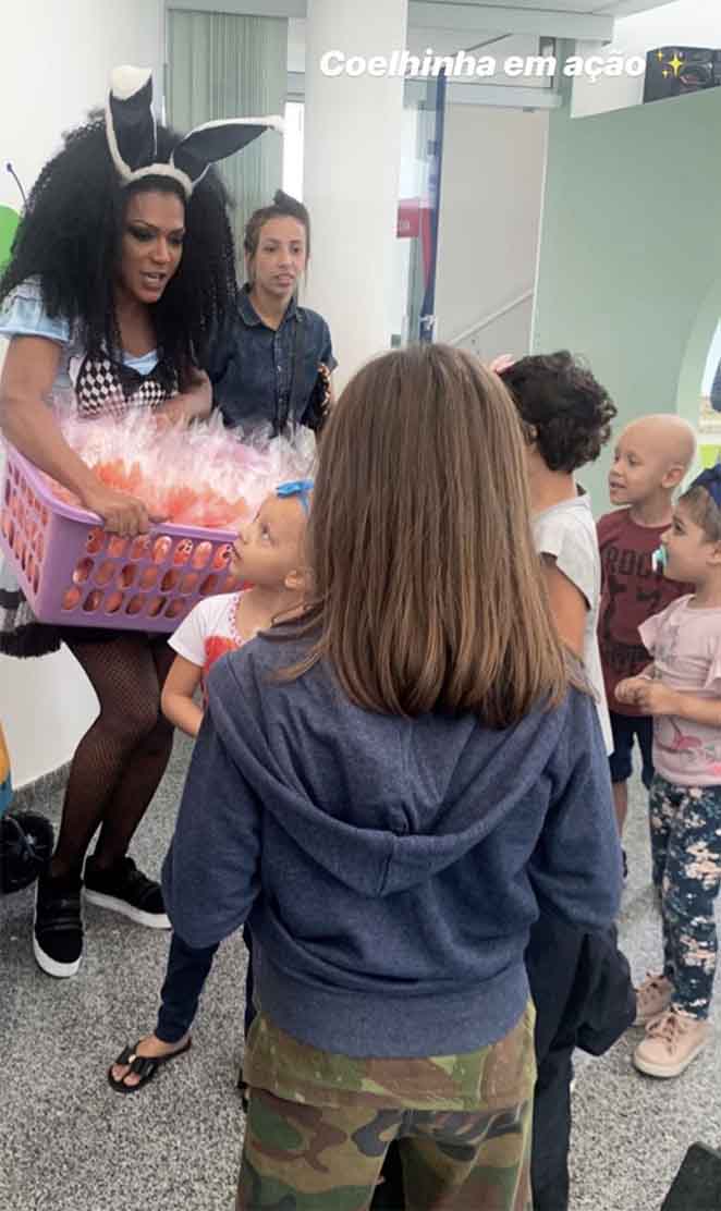 "O coração da gente transborda de amor, amo fazer o bem para as crianças . A gente também ganha porque o coração fica transbordando de alegria, sou extremamente grata a Deus por esses lindos momentos ", afirma Simone Sampaio, que chegou por lá vestida de coelhinha.