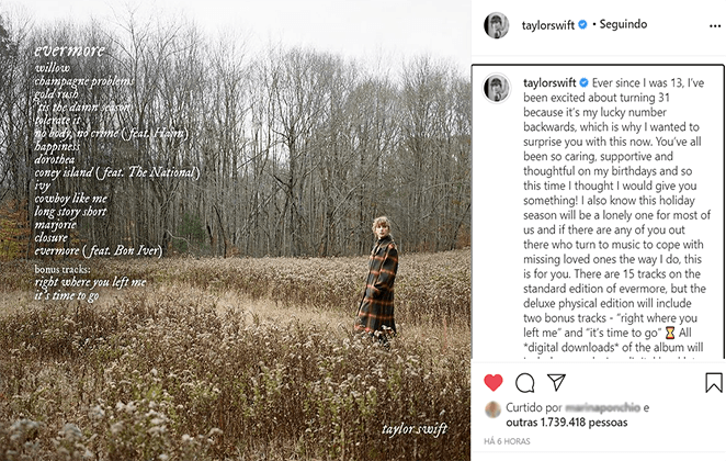 No Instagram, ela legendou o vídeo: "Bom, é dia 24/11 e 24-11=13, então tenho um anúncio… Vocês não viram esse filme antes… Folklore: The Long Pond Studio Sessions vai sair hoje à meia-noite no @DisneyPlus! #folkloreOnDisneyPlus", avisou.