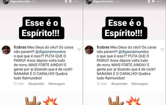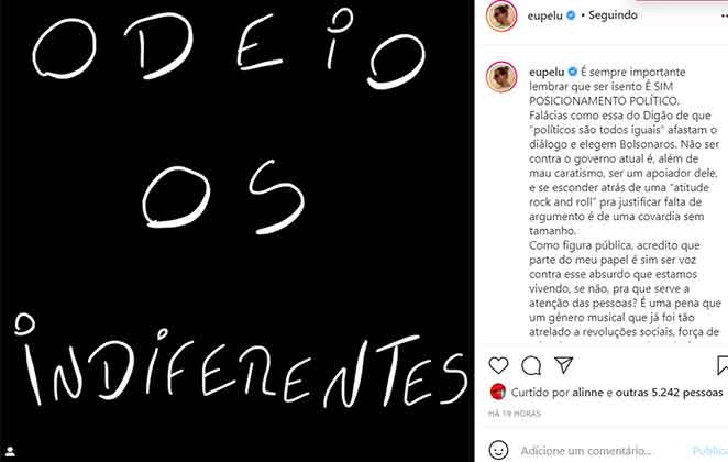 “Como figura pública, acredito que parte do meu papel é sim ser voz contra esse absurdo que estamos vivendo, se não, pra que serve a atenção das pessoas? É uma pena que um gênero musical que já foi tão atrelado a revoluções sociais, força de minorias, protestos, combate às forças estabelecidas, tenha alguns representantes tão vazios. Aos 'rockeiros reaças': Me desculpem, mas vocês não entenderam nada", escreveu.