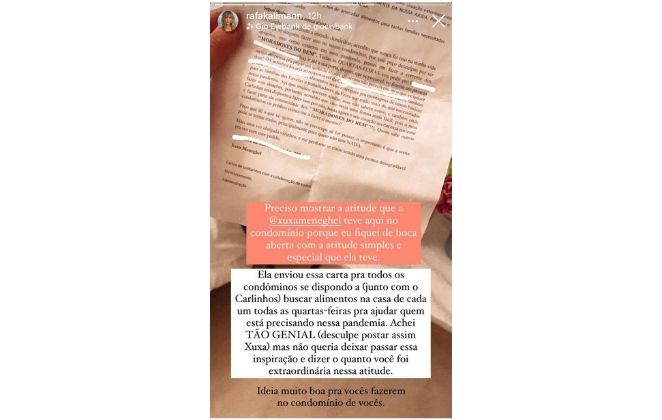 “Preciso mostrar a atitude que Xuxa Meneghel teve aqui no condomínio porque eu fiquei de boca aberta com a atitude simples e especial que ela teve. Ela enviou essa carta para todos os condôminos se dispondo (junto com o Carlinhos) a buscar alimentos na casa de cada um todas as quartas-feiras para ajudar quem está precisando nessa pandemia. Achei tão genial (desculpe postar assim, Xuxa), mas não queria deixar passar essa inspiração e dizer o quanto você foi extraordinária com essa atitude. Ideia muito boa para vocês fazerem no condomínio de vocês”, escreveu ela no Instagram.