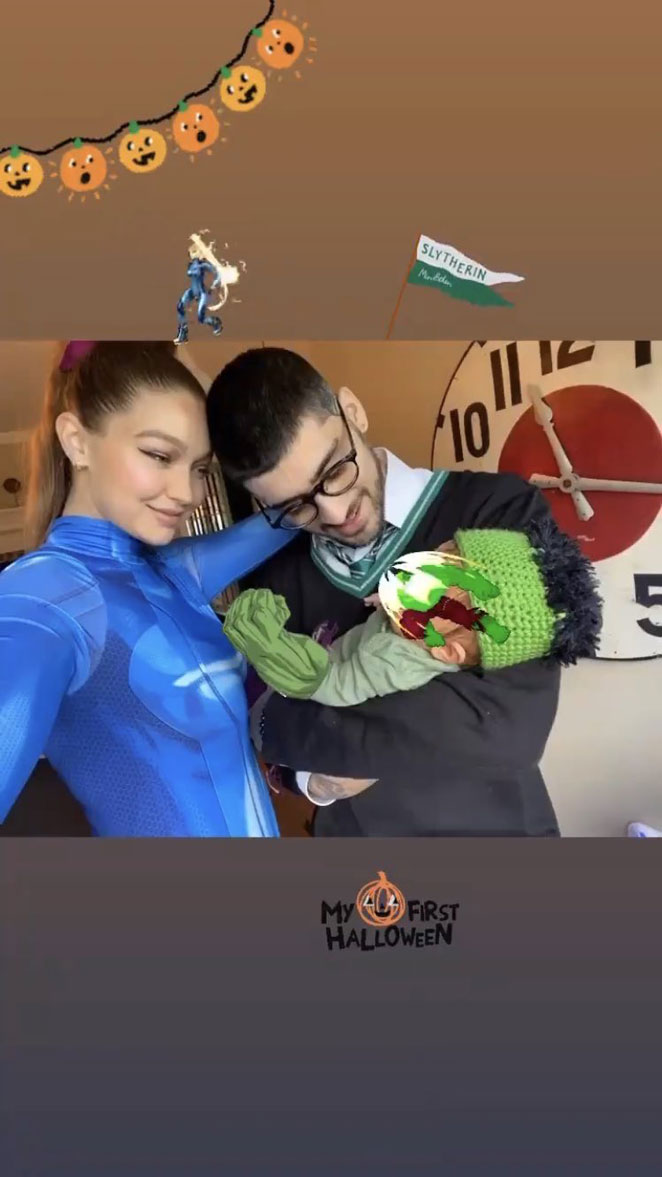 Em casa, Gigi e Zayn não deixaram o Halloween passar em branco e se fantasiaram para comemorar em casa. No Stories, a modelo postou uma foto na qual o músico, vestido de estudante da Sonserina, da saga Harry Potter, aparece segurando a filha no colo. A fantasia da pequena? O incrível Hulk! Com direito a chapéu de tricô. Uma fofura que só!