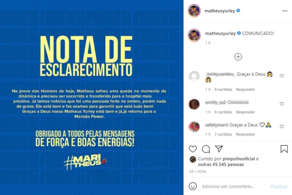 “Na Prova dos Homens de hoje, Matheus sofreu uma queda no momento da dinâmica e precisou ser socorrido e transferido para o hospital mais próximo. Já temos certeza que foi uma pancada forte no ombro, porém nada de grave. Ele está bem e fez exames para garantir que está tudo bem! Graças a Deus nosso Matheus Yurley está bem e já, já retorna para a ‘Mansão Power'”, dizia o comunicado.