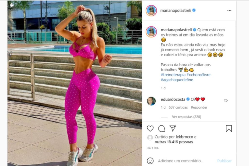 Mariana fez uma publicação sobre malhação em seu perfil oficial no Instagram, e Eduardo comentou um “Oi” com emoji de coroação, fazendo a musa perguntar em seguida se estava tudo bem. Eita!
