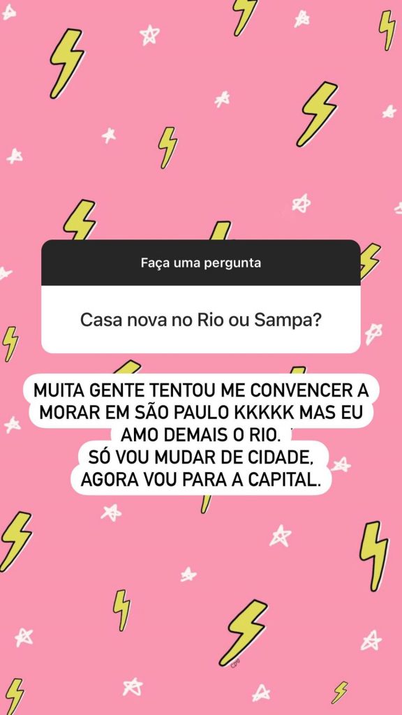 No Instagram, Camilla ainda respondeu perguntas de seguidores sobre a mudança. “Muita gente tentou me convencer a morar em São Paulo. Mas eu amo demais o Rio. Só vou mudar de cidade, agora vou para a capital”, contou ela.