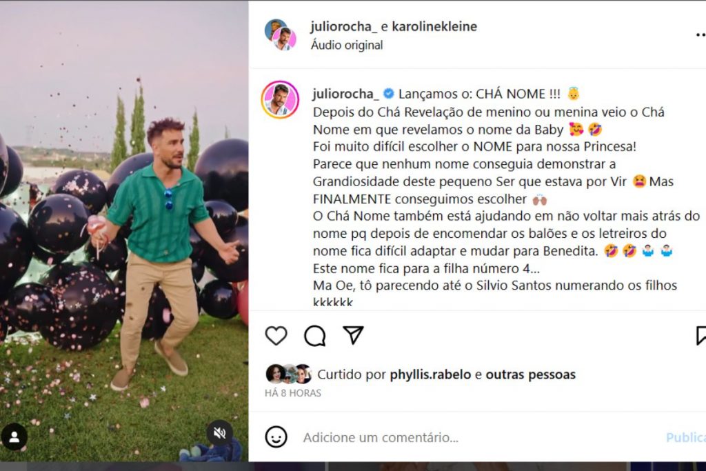 “Lançamos o CHÁ NOME !!! Depois do Chá Revelação de menino ou menina veio o Chá Nome em que revelamos o nome da Baby. Foi muito difícil escolher o NOME para nossa Princesa! Parece que nenhum nome conseguia demonstrar a Grandiosidade deste pequeno Ser que estava por Vir. Mas FINALMENTE conseguimos escolher. O Chá Nome também está ajudando em não voltar mais atrás do nome porque depois de encomendar os balões e os letreiros do nome, fica difícil adaptar e mudar para Benedita. Este nome fica para a filha número 4… ‘Ma Oe’, tô parecendo até o Silvio Santos numerando os filhos. Só me falta a grana do Silvio para bancar esta filharada toda. Finalmente podemos chamar nossa bebê pelo nome e vocês pararem de chamar ela de Benedita”, escreveu o ator.
