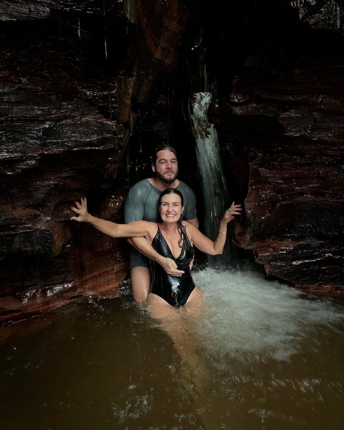 Em outro clique, os dois apareceram coladinhos se divertindo na queda de uma cachoeira e Fátima, num raro registro, aparece de maiô. Já na última imagem, o político apareceu carregando várias malas e mochilas, de máscara, no aeroporto.