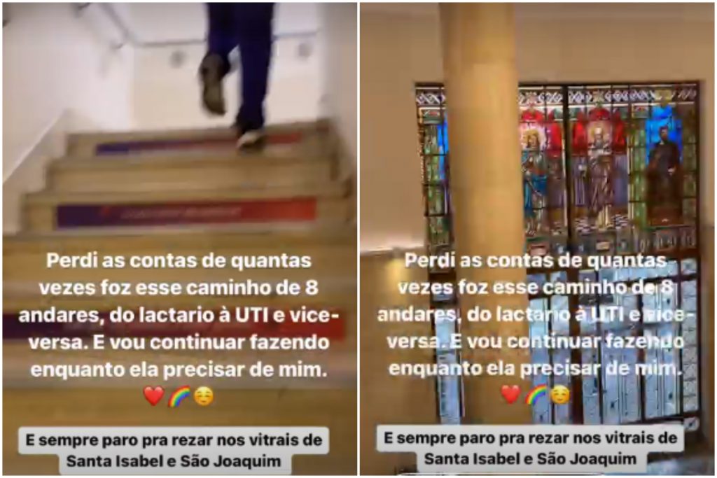 “Perdi as contas de quantas vezes fiz esse caminho de oito andares, do lactário à UTI e vice-versa. E vou continuar fazendo enquanto ela precisar de mim. E sempre paro para rezar nos vitrais de Santa Isabel e São Joaquim”, escreveu ela, em um vídeo em que mostra o sobe e desce do percurso de modo acelerado.