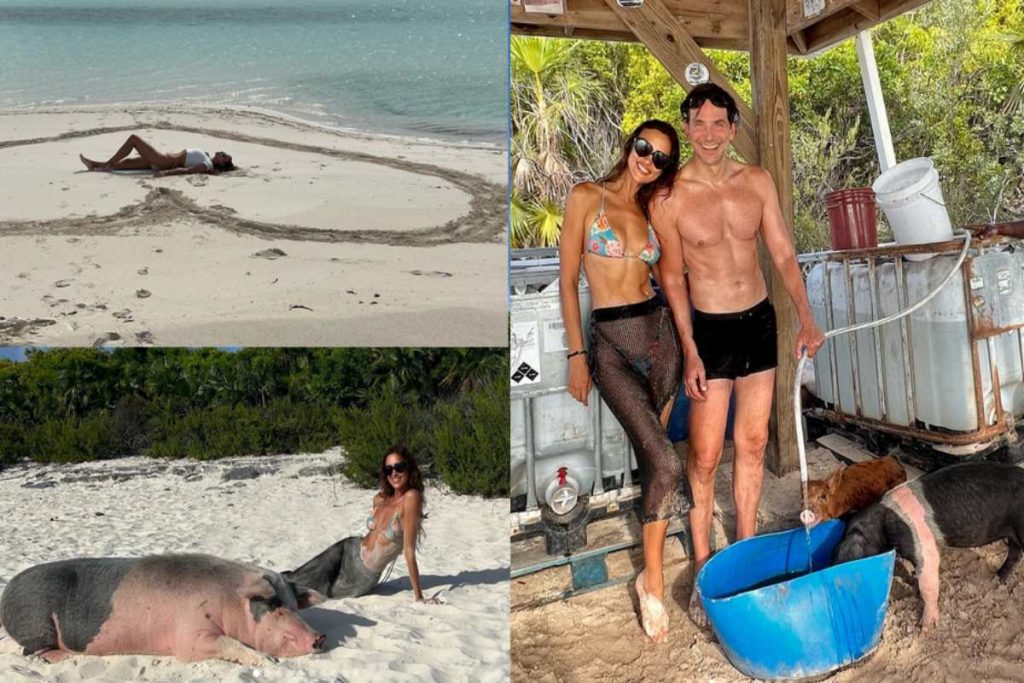 Shayk posou sozinha no primeiro clique, na areia, de biquíni colorido e sorrindo ao lado de um porco. A foto foi feita pelo ator.